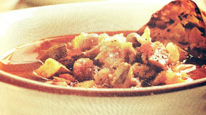 - Add carrot, undrained tomatoes, cabbage, zucchini, potato, thyme, stock, drained chickpeas, water and the whole celery stalk, with leaves attached.
